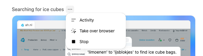 Je kunt op elk moment ‘controle overnemen’. Doe dat aan het begin, zodat je zelf kunt inloggen op je supermarktaccount, en helemaal aan het einde om de betaling af te ronden. Geef nooit, maar dan ook echt nooit, je betaalgegevens aan een AI-agent!