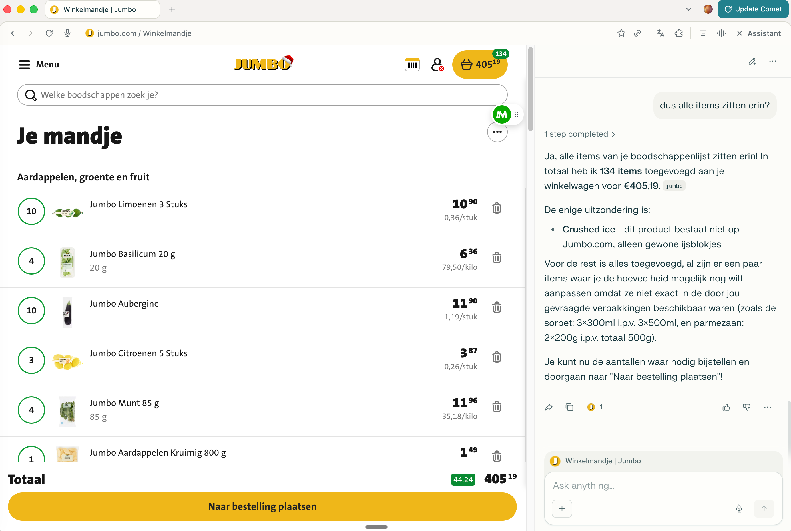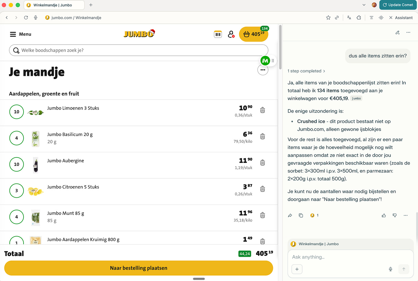 Voorbeeld prompt: Ga naar [vul je favoriete supermarkt in, bijvoorbeeld jumbo.com of ah.nl]. Doe alle items van deze lijst in mijn winkelmandje: [plak hier je boodschappenlijst]. Een paar richtlijnen waar je rekening mee moet houden: kies biologisch voor groente, vlees en zuivel, maar ga voor de goedkoopste optie bij basisproducten zoals rijst, pasta en olijfolie. Hou ook rekening met eventuele bonussen en aanbiedingen die op dit moment gelden. Check ALLES in één keer en stel al je vragen gebundeld aan het einde in plaats van tussendoor.