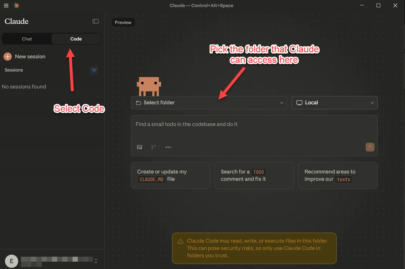 Maak een TEST folder op je desktop waar Claude Code in kan werken en selecteer die in drop down ‘Select folder’.