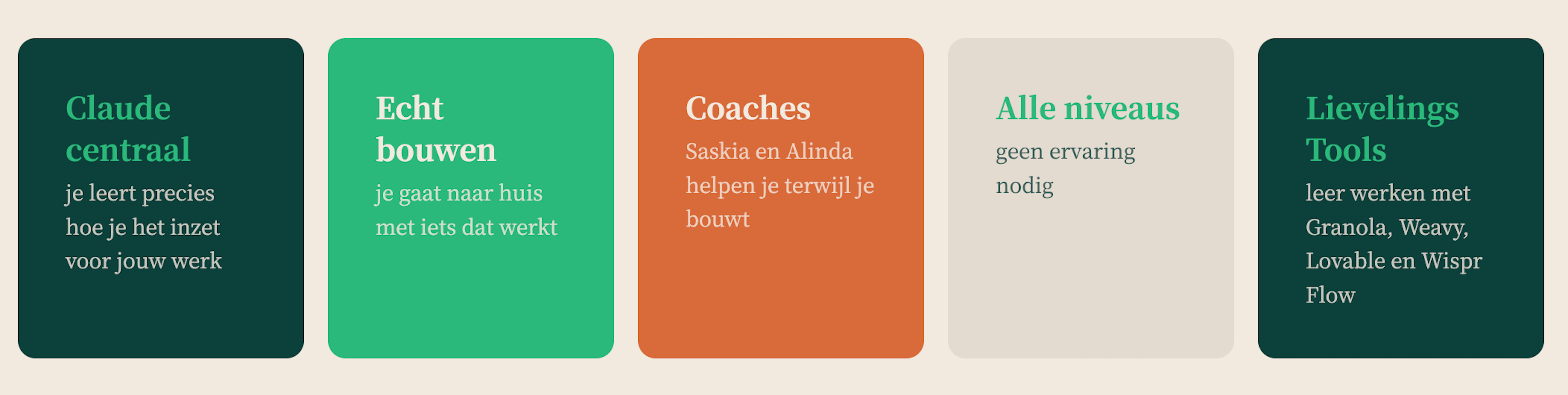 Het is voor iedereen, alle niveaus. Of je nu net begint of al een tijdje bezig bent. We beginnen bij de basis en nemen je stap voor stap mee. Je hoort overal “Claude”, maar wat is nou een Claude-project? Wat is Cowork? Hoe is Claude Code? En wat is het verschil? Wat zijn skills? En hoe maak je die? En hoe zet je je connectors aan? Wij leggen het uit, en zetten het samen met jou zo op dat het daarna echt voor je gaat werken. De dag is zo opgebouwd dat iedereen op haar eigen niveau aan de slag gaat en met een werkende setup de deur uitloopt.