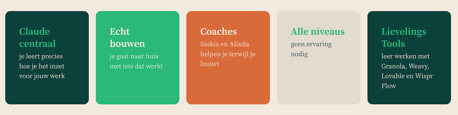 Van lezen naar doen. Je bent slim, gedreven, en je snapt allang dat AI niet meer weggaat. Je hebt alleen nog niet de tijd genomen om het echt te doen. Die tijd komt niet vanzelf. Die máák je.