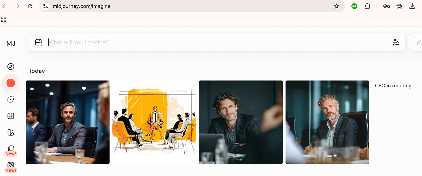Een voorbeeld uit het beeldmodel Midjourney: als wij ‘CEO in meeting’ invoeren als prompt, krijgen we zonder uitzondering afbeeldingen terug van witte mannen van middelbare leeftijd.