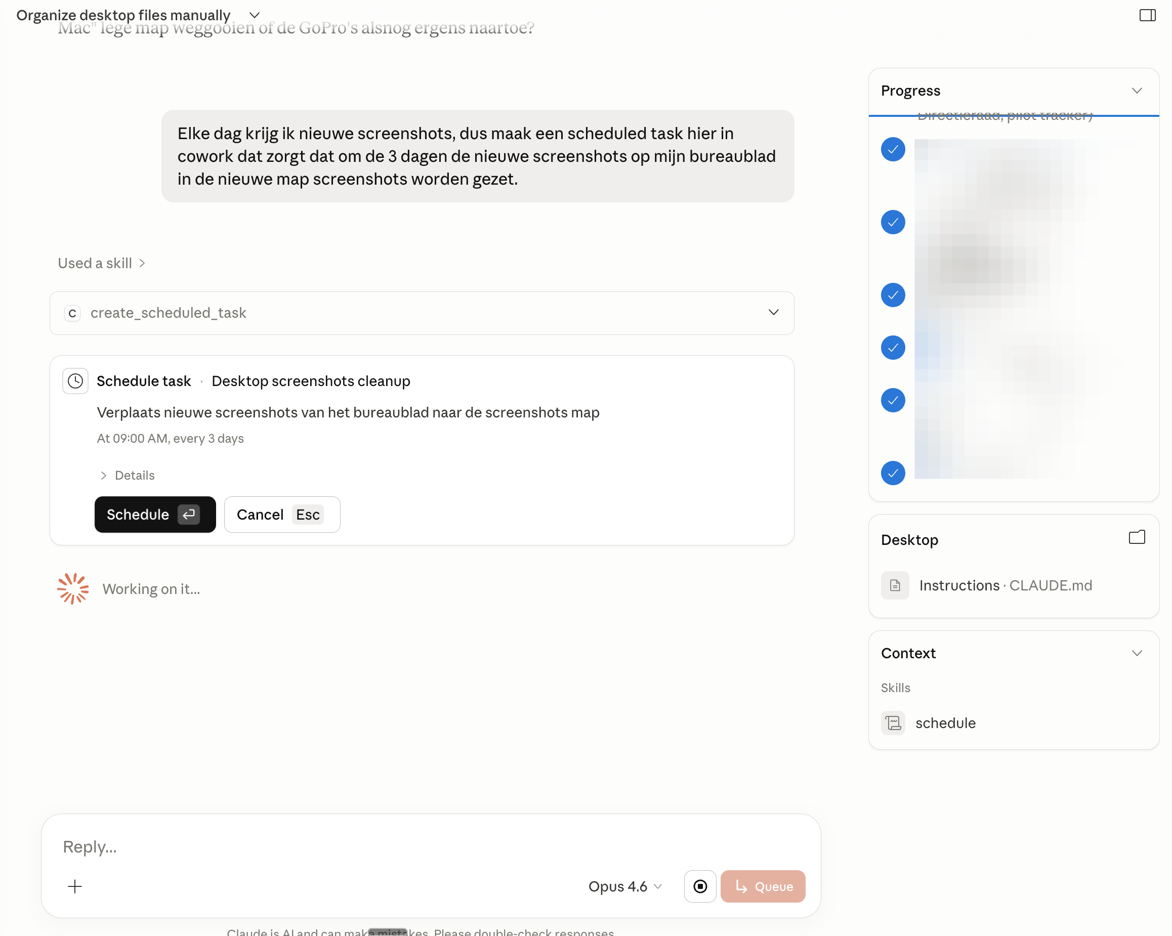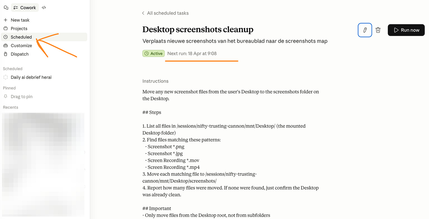 Stel je nu voor dat Claude om de drie dagen zelf je bureaublad opruimt, zonder dat je het vraagt, want die screenshots blijven zich natuurlijk opstapelen. Dat kan met een Scheduled Task.