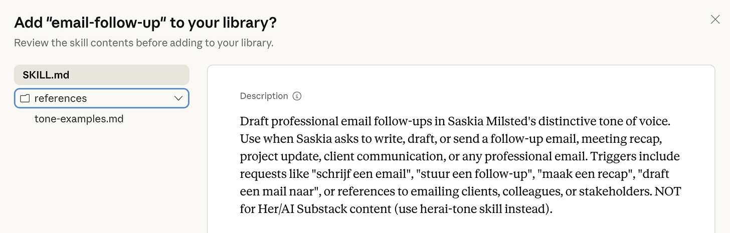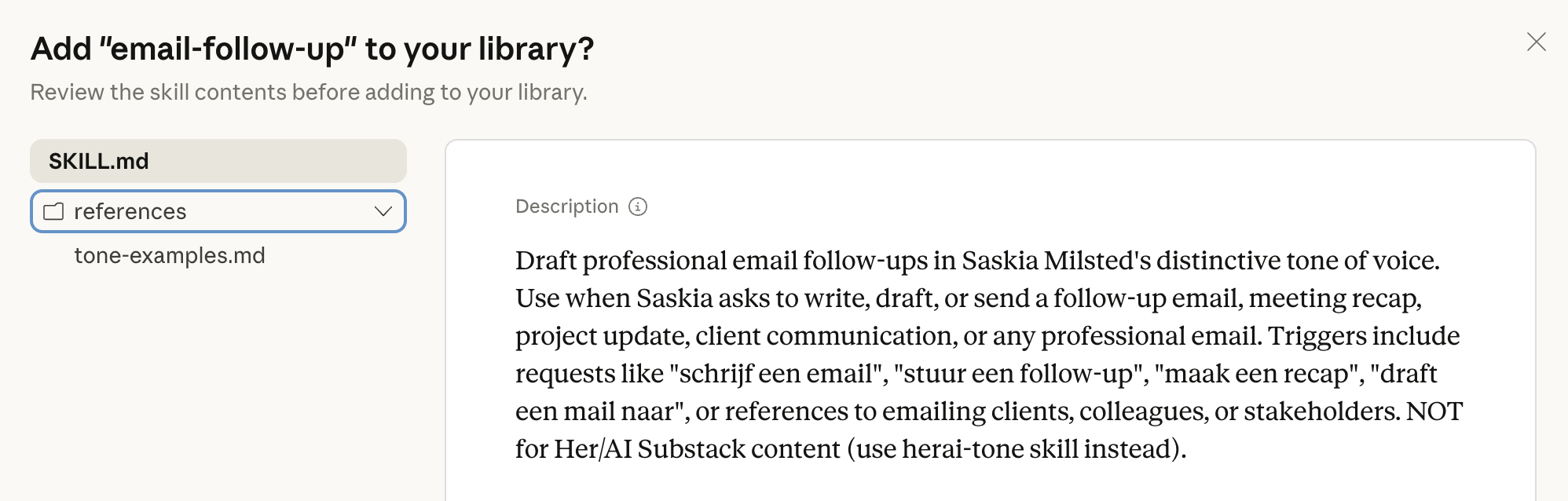 Neem onze e-mail follow-up Skill. Elke keer als we typen “ga naar de laatste meeting en schrijf een follow-up mail”, herkent Claude dat het die Skill moet activeren. Het loopt de handleiding door: wat voor mail is het, naar wie gaat die, welke toon past daarbij, en pas dan schrijft het de mail.