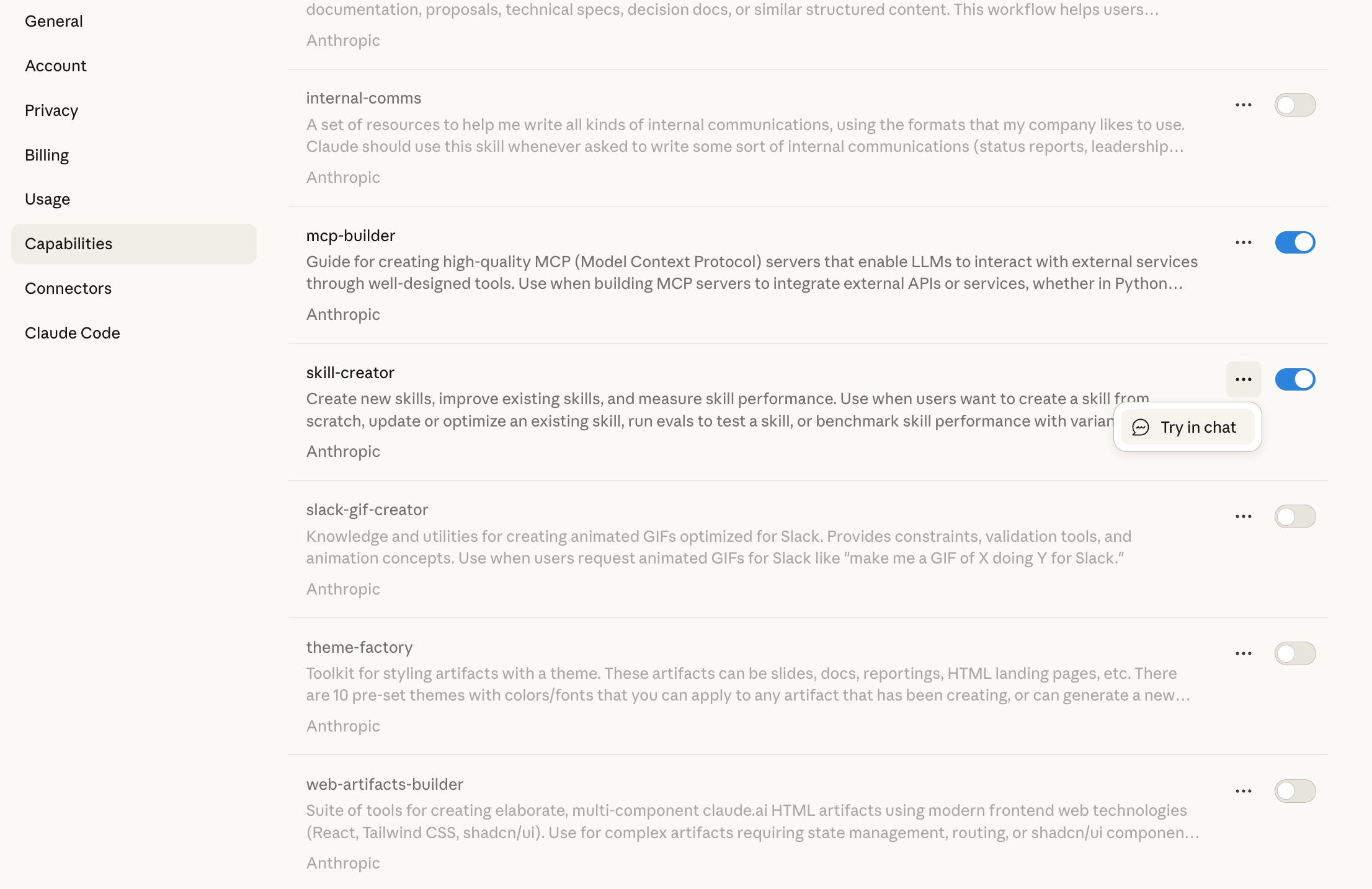 Een Skill maak je eenvoudig met de Skill Creator die Anthropic klaar heeft staan. Ga naar Settings → Capabilities → Example Skills → Skill-Creator. Die begeleidt je stap voor stap.