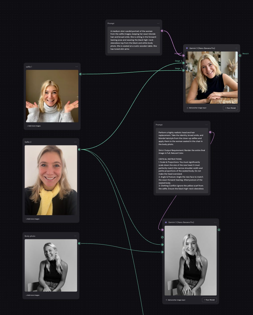 De kracht van deze tool: je werkt met nodes: je combineert meerdere referentiefoto's en bouwt stap voor stap voort op nieuw gecreëerde beelden, waardoor je steeds dichter bij het gewenste resultaat komt. Je kan ook kiezen welk AI-model je gebruikt. Wij zweren bij Nano Banana Pro, en de experts ook. We laadden credits op, zetten er een LinkedIn-foto in als referentie samen met twee selfies, en voegden een prompt toe.